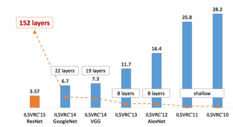 Imagenet 挑战赛获胜者错误率 VS 网络中的层数(来源: