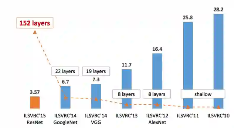 当然这有点过于简单化,但如果我们看一下主要的「图像识别竞赛」,即 ImageNet 挑战,我们就可以看到错误率随着神经网络的深度增加而降低。人们普遍认为,排除其他因素,网络深度的增加将带来更好的泛化能力和准确性。