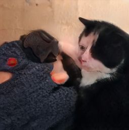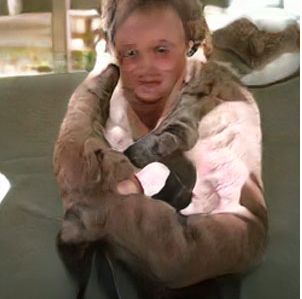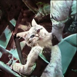 是不是,可爱、萌萌的猫的形象,从此“颠覆”了。就像外太空来的生物,怪诞、畸形,看了令人浑身上下不舒服。尤其是,当猫脸和人脸在同一张图片中呈现时,那个“画风”简直了。读者可以从下面的照片中体会一下: