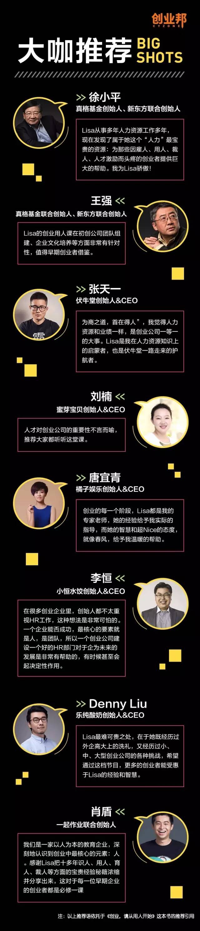 对人的选、用、育、留、裁,是每个创业者必须面临的问题,是创业者的一堂必修课,不管你是出于创业的哪个阶段,都离不开招人、用人和开人。因此,创业邦&真聘联合推出了一套人力资源系列课,从初期的组建团队到后期的开人留人,由Lisa老师为你全面讲解:
