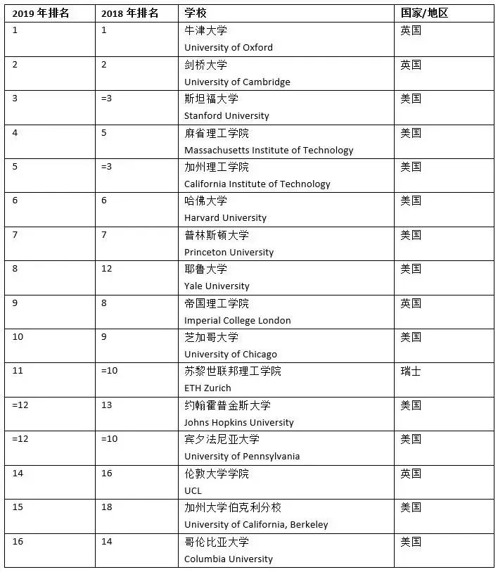 牛津大学连续第三年排名第一,同时在研究方面(数量、收入和声誉)高居榜首。剑桥大学保持第二,美国斯坦福大学稳居第三。麻省理工学院名次上升一名,排名第四,加州理工学院排名则从去年的并列第三下降到第五位,不过该校教学项(学习环境)排名全球第一。耶鲁大学是前20名中名次提升最快的高校,上升四名,进入前十名,排名第八。