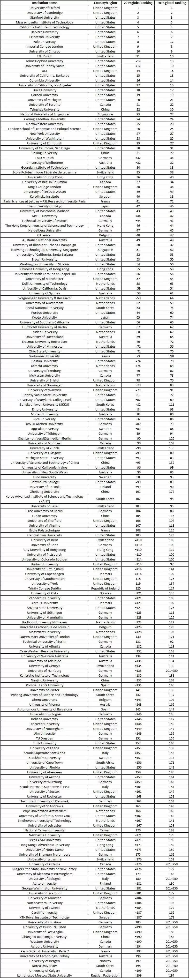 附泰晤士高等教育2019年世界大学排名TOP200: