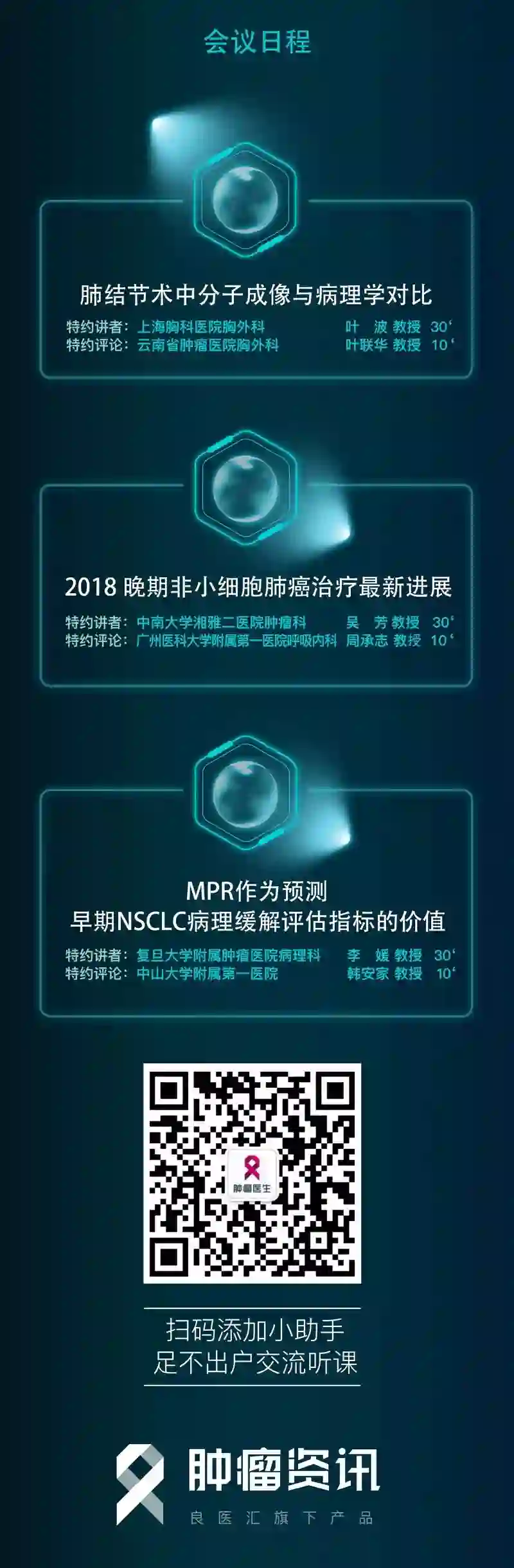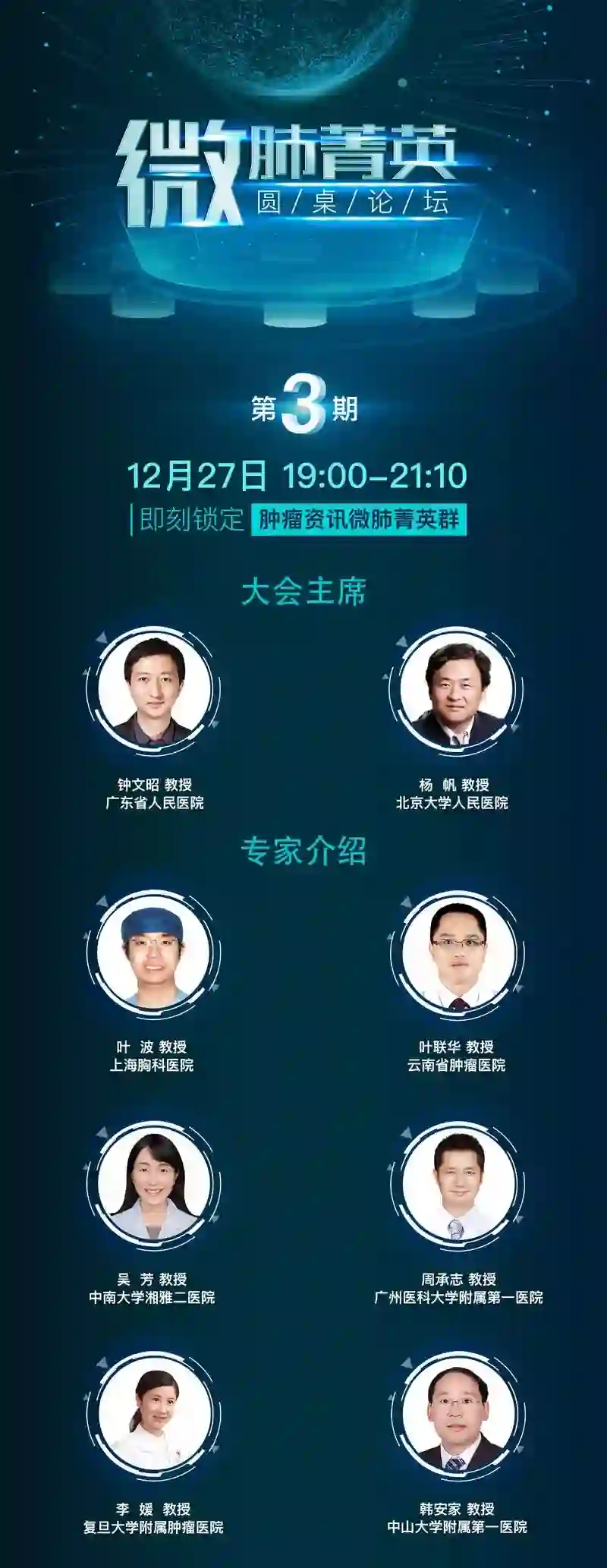 来自广东省人民医院的钟文昭教授和北京大学人民医院杨帆教授两位主席共同主持本次会议。上海胸科医院叶波教授、云南省肿瘤医院叶联华教授、中南大学湘雅二医院吴芳教授、广州医科大学附属第一医院周承志教授、复旦大学附属肿瘤医院李媛教授、中山大学附属第一医院韩安家教授和您相约《微肺菁英圆桌论坛》!