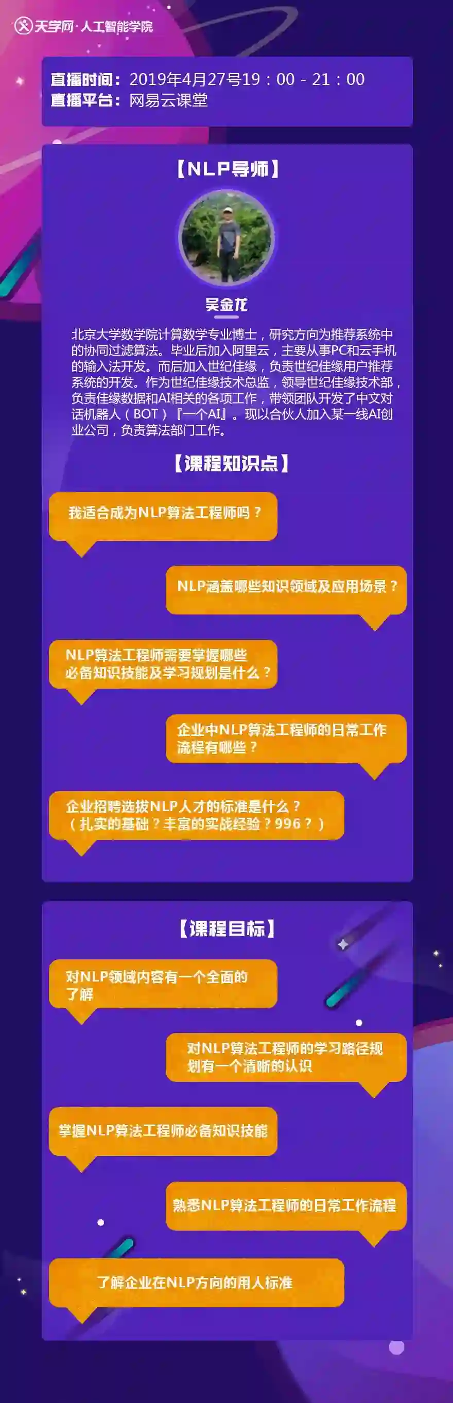 此次,相信通过吴金龙导师长达两个小时的直播亲授,能帮你更好地理解NLP的学习与职场规划。