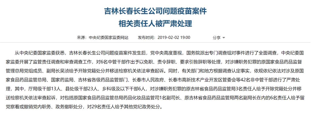 1.吉林长春长生公司问题疫苗案件相关责任人被严肃处理