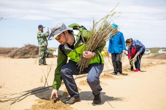 蚂蚁森林项目牵头,民间组织和政府机构共同牵手,在适宜造林的地区选择合适的树种,把树苗交给当地居民栽种管理,林权归居民所有。比如这次在毛乌素沙地,蚂蚁森林选择的是沙柳,这是一种灌木,当地优势树种。在沙丘和湿地之间,最常见到的植物就是一丛一丛的沙柳。它的繁殖极其容易,春天砍下它的枝条,裁成一截一截,插到沙里就能成活。砍掉它的枝条,在林业术语里称作“平茬”,非但不会危及沙柳的生存,还能促进它们的生长。