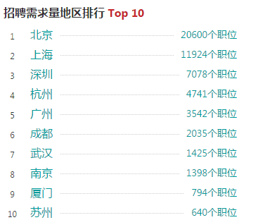 而这些招聘需求的地区分布,以北京、上海为主,深圳、杭州、广州紧跟其后。