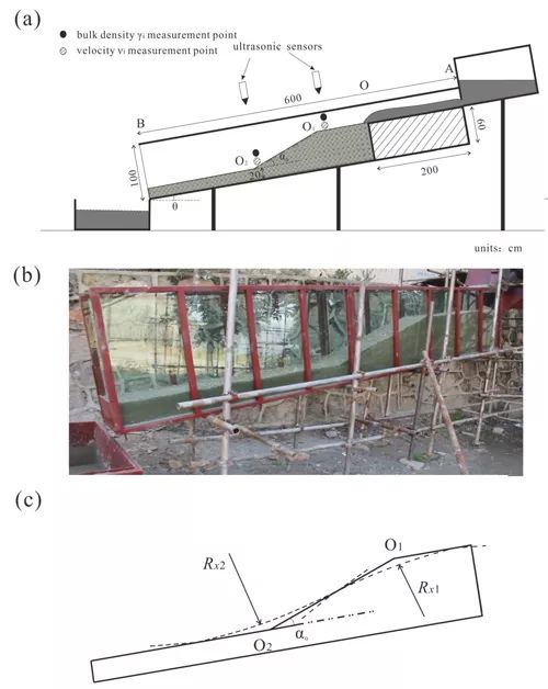 通过开展野外实地考察和室内水槽试验,研究团队发现泥石流沟道中存在两种典型的侵蚀方式:剪切侵蚀和冲击侵蚀,前者以层与层之间的剪切力为侵蚀动力,后者表现为泥石流体与底床的正面冲击效应。由此通过推导,得到非均匀坡沟道中泥石流侵蚀率计算公式:。该研究用一个曲率半径的函数来刻画沟道纵剖面形态变化对侵蚀的影响,并将冲击侵蚀项加入非均匀坡沟道中泥石流侵蚀率计算中。