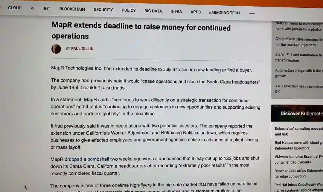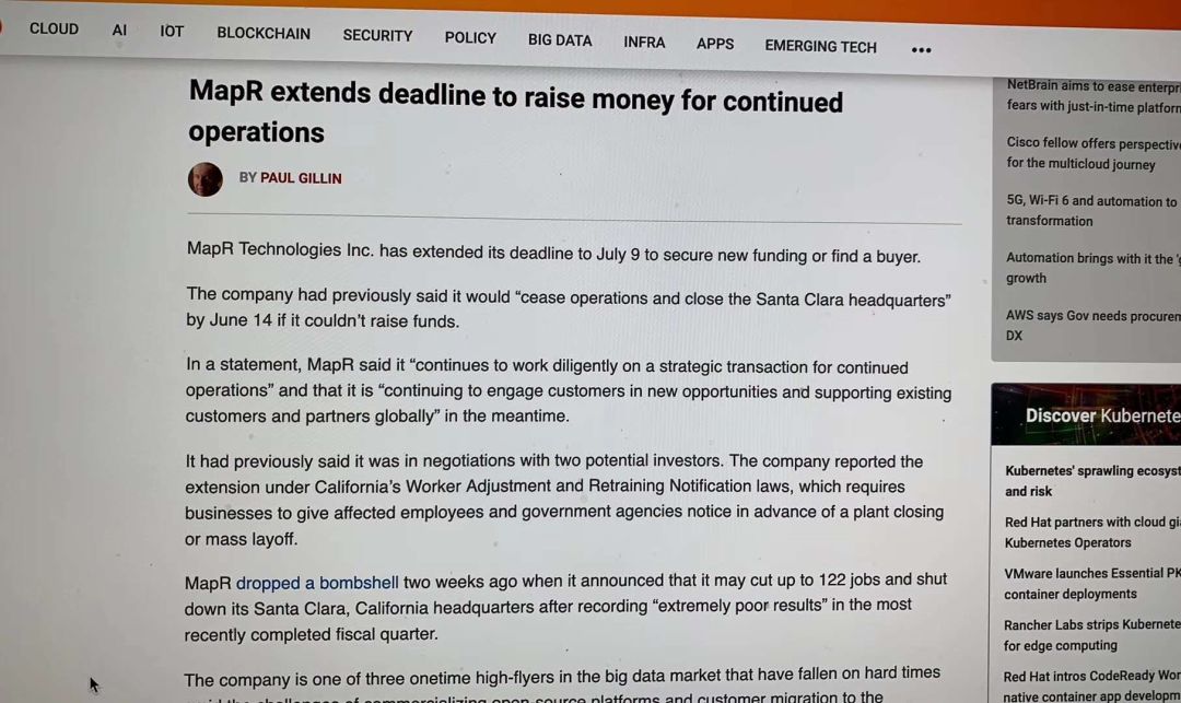 相比于抱团取暖的 Cloudera 和 Hortonworks,MapR 的处境更为艰难了,甚至走到了“闭店裁员”的窘境,“如果再获得新的资金注入,MapR 可能会裁员 122 人,并关闭位于 Santa Clara 的总部。”据外媒报道,MapR 裁员将于 6 月 14 日生效,但是就在前几日,有消息称 MapR 将寻找新资金的最后期限延长到了 7 月 9 日。