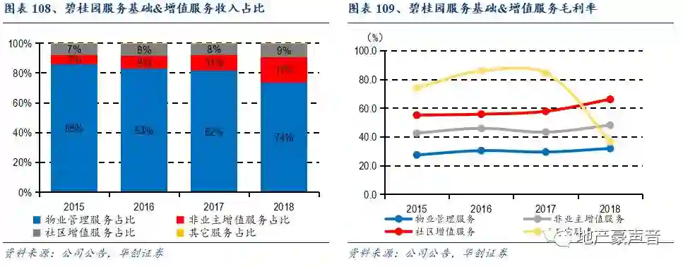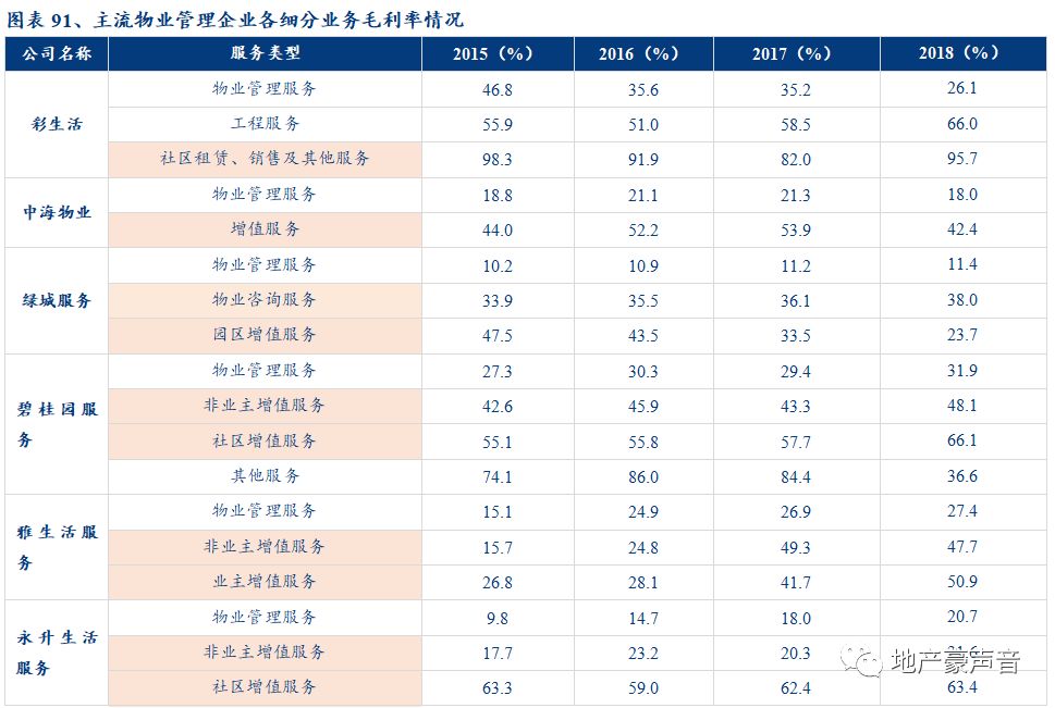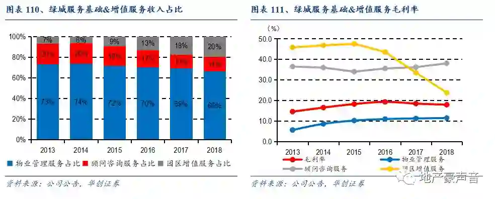此外,与基础服务劳动密集型行业属性不同,增值服务更多是依托社区的流量优势,以及平台的变现入口,进行价值变现。基础服务由于人力的限制,较难出现规模效应,而增值服务则无此限制,更容易实现规模效应。因此,增值服务的毛利率远高于基础服务。2018年,碧桂园服务的基础服务毛利率为31.9%,非业主增值服务、社区增值服务的毛利率分别为48.1%、66.1%;绿城服务基础服务毛利率为11.4%,顾问咨询服务、园区增值服务的毛利率分别为38.0%、23.7%。主流物业公司增值服务的毛利率均远高于基础服务毛利率。