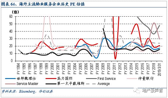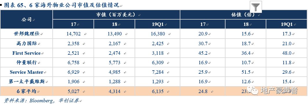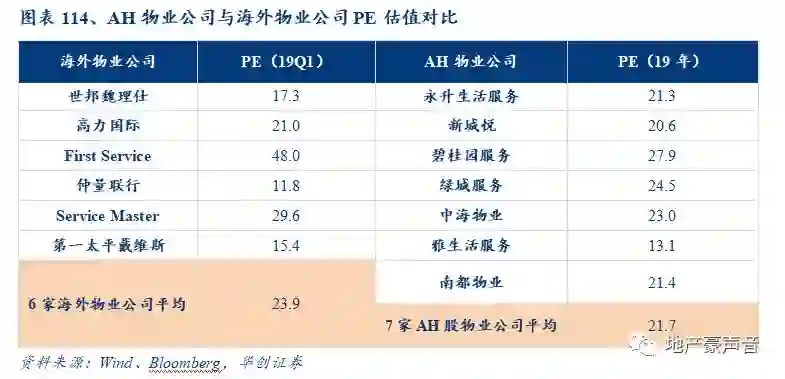 对比海外物业公司和AH物业公司估值,2019Q1末,世邦魏理仕、高力国际、First Service、仲量联行、Service Master、第一太平戴维斯的PE估值分别为17.3倍、21.0倍、48.0倍、11.8倍、29.6倍、15.4倍,6家海外主流物管企业平均PE估值为23.9倍,高于7家AH股主流物管公司(永升生活服务、碧桂园服务、新城悦、绿城服务、中海物业、雅生活服务、南都物业)平均PE估值21.7倍,显示物管公司PE估值合理区间或为20-30倍。