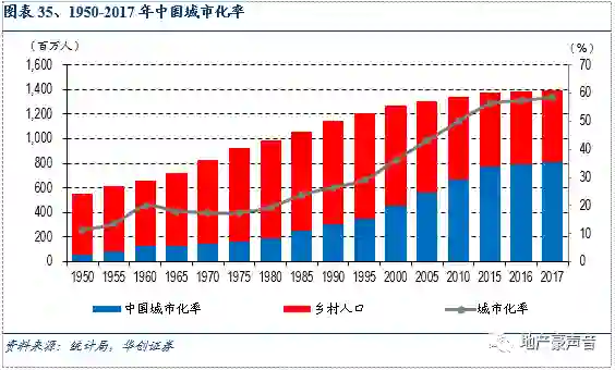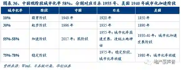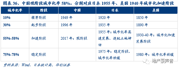 长远来看,中国的城镇化空间仍然巨大。2018年中国城镇化率约59.6%,而美国和日本分别在1940年和1955年达到了56.5%和56.1%,且距离美国目前城镇化率82%、日本的91%仍有较大差距。