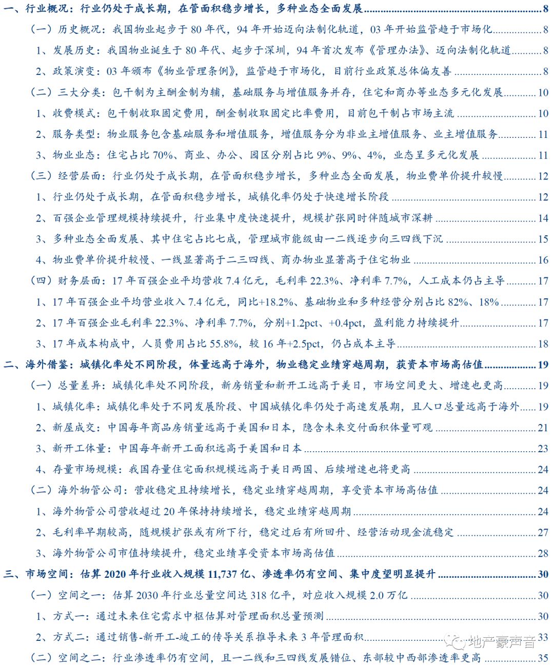 继承我国房地产行业特色,我国物业管理行业将注定呈现出一个规模大、增速高的蓝海市场,预计2030年末行业市场规模将高达2万亿元,远高于美日两国,并较目前规模有望翻番;近年来住宅销售高位稳定、竣工交付加速、物管渗透率提升等积极因素将综合推动行业进入规模爆发期,而在这大行业、小公司的格局中,房企集中度跳增和物管证券化加速等有利因素则将大幅推升物管集中度,预示着物管龙头将拥有巨大的成长空间;此外,物管行业的弱波动式稳定增长也将奠定其穿越周期的能力。我们首次覆盖物业管理行业,并给予“推荐”评级,对比国内外案例,我们认为物管公司合理PE20-30倍、PEG0.68倍,并且业绩增速越高应享受更高估值,建议关注:1)背靠母公司型的高成长物管公司:新城悦(1755.HK)、碧桂园服务(6098.HK)、永升生活服务(1995.HK);2)商办类稀缺型物管公司:中航善达(000043.SZ);3)优质服务型物管公司:绿城服务(2869.HK)。