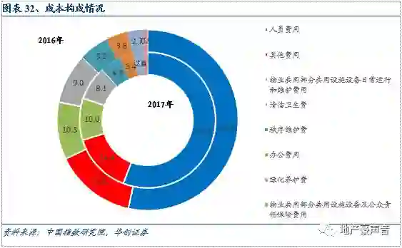 2017年,百强企业经营成本均值为5.7亿元,同比增长14.3%。成本构成来看,2017年,人员费用占比总成本55.8%,较2016年+2.5pct,人员费用仍是成本最大部分,主要源于企业的规模扩张与转型升级,对人员的数量和质量都提出了更高的要求,以及员工工资的刚性上涨;其它费用、物业共用部分共用设施设备日常运行和维护费用、清洁卫生费、秩序维护费、办公费用、绿化养护费占比分别为14.4%、10.0%、8.1%、4.9%、3.4%和2.4%;物业共用部分共用设施设备及公众责任保险费用占比为0.9%。