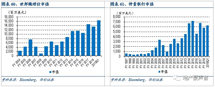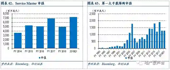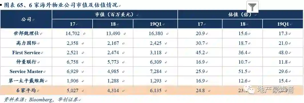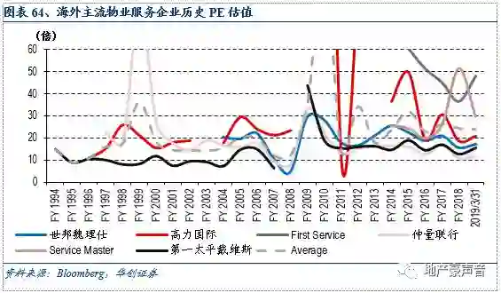 2019年一季度末,First Service、高力国际、世邦魏理仕、仲量联行、Service Master、第一太平戴维斯的市值分别为31.2亿美元、24.2亿美元、163.8亿美元、63.1亿美元、72.8亿美元、12.9亿美元。除08年全球金融危机外,海外主流物管企业市值自上市后均实现较稳定的提升。截至2019年1季度末,First Service、高力国际、世邦魏理仕、仲量联行、Service Master、第一太平戴维斯PE估值分别为48.0倍、21.0倍、17.3倍、11.8倍、29.6倍、15.4倍,6家主流物管企业平均PE估值为23.9倍,高于美国4家龙头房企(霍顿、莱纳、普尔特、NVR)平均PE估值9.6倍。