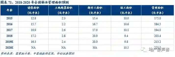 2018年全国商品房销售面积为17.2亿平方米,同比增长1.3%;土地购置面积为29,142万平方米,同比增长14.2%;2018年商品房和住宅的新开工面积分别同比增长17.2%和增长19.7%,商品房和住宅的竣工面积分别同比下降7.8%和下降8.1%。一方面,2016-2018年商品房销售面积同比分别为+22.5%、+7.7%、+1.3%,新开工面积同比分别为+8.1%、+7.0%、+17.2%,销售带动新开工的高增,同时叠加目前行业资金环境改善,综合来看,预计将带动2019-2020年的竣工增速明显提升。考虑到2018年竣工面积同比-7.8%,并预计2019-2020年房屋竣工面积同比分别+5.0%、+7.0%,对应竣工面积分别为9.8亿平米、10.5亿平米,因此预计2018-2020年物业管理面积分别为203.4亿平米、213.2亿平米、223.7亿平米,略高于方法一预测数据,主要源于竣工面积中包含设备用房、地下面积、以及烂尾项目等因素影响,所以真实在管理面积的增量上面会有一定折扣。