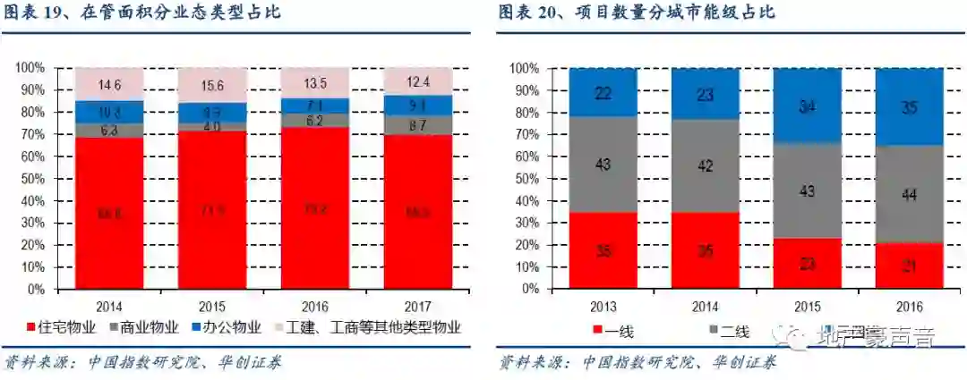 分城市能级来看,2016年,一线城市、二线城市、三四线城市的项目数量分别占比21%、44%、35%,较2015年分别-2pct、+1pct、+1pct,管理城市能级逐步由一二线向三四线下沉。