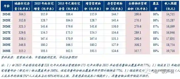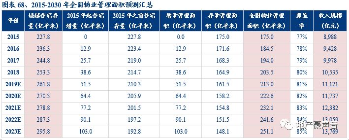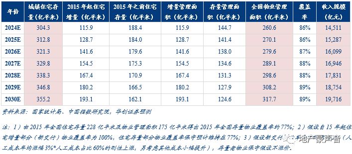 一方面,通过城镇化率、人均住房面积、以及城镇存量住房更新率估算出2015年全国城镇住宅存量约为227.8亿平米,并且估算2016-2030年的住房增量需求合计为194.0亿平米,对应未来15年内的年均住房需求为12.9亿平米;另一方面,据中指院数据,2015年全国物业管理面积175亿平米,对应物业覆盖率77%,我们保守预计未来15年存量住宅的物业覆盖率维持不变(即目前尚无物业管理的老旧小区未来仍维持现状),而每年新交付的新盘物业覆盖率为100%,据此估算2016-2030年的物业管理面积增量合计为142.7亿平米,对应未来15年内管理面积年均增长9.5亿平米。其中,估算出2016、2017年的管理面积分别为184.5亿平米、194.0亿平米,接近于中指院数据,2016年185亿平米、2017年195亿平米;并估算2018-2020年,全国物业管理面积分别为203.5亿平米、213.0亿平米、222.6亿平米,分别同比+4.9%、+4.7%、+4.5%。物业费单价方面,考虑到人工成本年均涨幅3%的刚性上涨及人工成本占比60%,另考虑其他成本或小幅提升,假设新交付物业单价年均涨幅约2%,存量老物业则保守假设不涨价。长期来看,我们估算到2030年,全国物业管理面积将达到318亿平米,对应收入规模约2.0万亿。