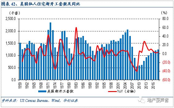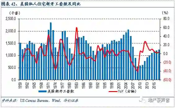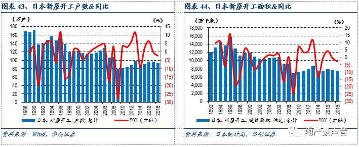 同新房成交量一样,中国每年的房屋开工量也远高于美国以及日本。2018年,中国房屋新开工面积20.9亿平米,同比+17.2%,粗略按照套均100平米估算,2018年中国新开工约2,090万套,2018年,美国私人住宅新开工125.0万套,日本新屋开工户数94.2万户,分别为中国的6.0%、4.5%。