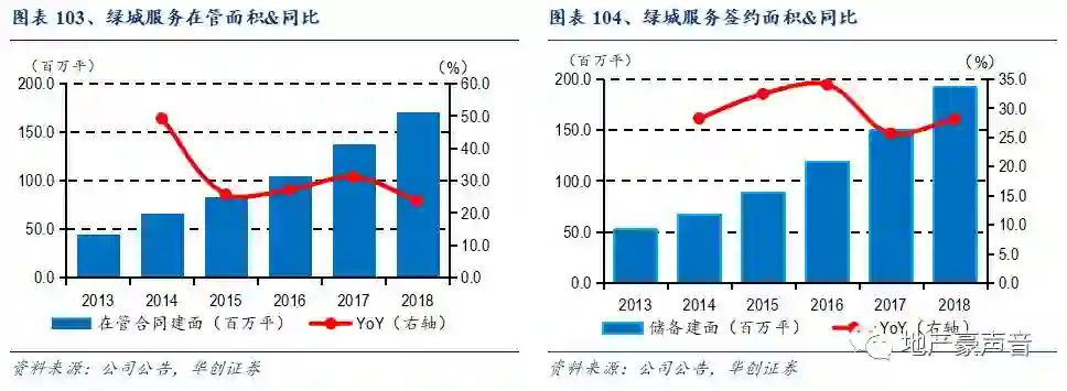目前行业主流房企大多具有自己的物业公司,为其提供物业服务,但仍有大量中小开发商并没有配备相应的物业公司,因此,物业管理公司可以和市场上独立第三方的开发企业形成战略合作,承接第三方开发企业的物业管理,从而拓展管理面积规模。行业内具备代表性的绿城服务,截至2018年末,绿城服务在管面积1.7亿方,同比+23.7%;储备面积1.9亿方,同比+28.1%。绿城服务是行业内典型的依靠品质和口碑不断拓展第三方业务的物业服务公司,2013-2017年在管面积CAGR为32.9%,签约面积CAGR为30.0%,增速稳定,且截至2018年末公司储备面积1.9亿方,按照平均4年的转化速度估算,存量签约面积每年可转化为在管面积约4,800万方,对应19年在管面积增速28.2%,考虑到公司签约面积仍保持较稳定增速,管理面积增速有较强保障。另一方面,依靠品质和口碑拓展第三方管理面积的方式对于物业公司的管理和服务品质要求较高,口碑需要较长时间的市场检验,且保证服务品质必然会面临成本的上升,对于公司成本管控的要求较高,因此这种方式相对来说有一定壁垒,可复制性不高。