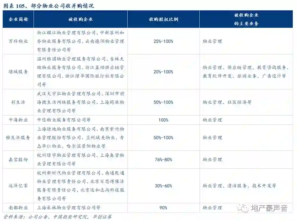 3)通过收并购获取管理面积提升的物业公司:例如彩生活等。除了获得兄弟企业的交付面积和第三方拓展之外,物业企业还可以通过收购存量物业公司,从而获得后者的在管面积。这种方式的优势在于,收并购对于公司服务品质没有严格的要求,只要公司资金充裕,可复制性较高。但另一方面,收购可能会产生商誉,可能面临商誉减值的问题;其次,收购在带来管理面积增加的同时,由于项目管控层次不齐,也会增加管理压力,甚至会对公司的品质口碑带来一定损害。