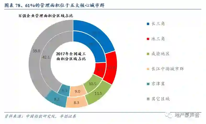 我国的空间发展格局以城市群为核心,衍生出巨大的住房与物业管理需求。2017年,百强企业中61.0%的管理面积位于五大城市群,高于2017年全国五大城市群竣工面积占比58.7%。其中,在长三角、珠三角、成渝、长江中游及京津冀五个主要城市群分别占比20.1%、12.8%、11.5%、8.3%及8.2%。随着城镇化率不断提升,一方面,五大城市群的物业管理需求继续增长,同时,其它区域的潜在住房与物业管理需求空间巨大。此外,从主流物业公司在管面积和收入占比情况来看,目前物业管理服务区域仍主要集中在长三角、华东、华南等区域,中西部区域物业管理服务潜在需求较大。