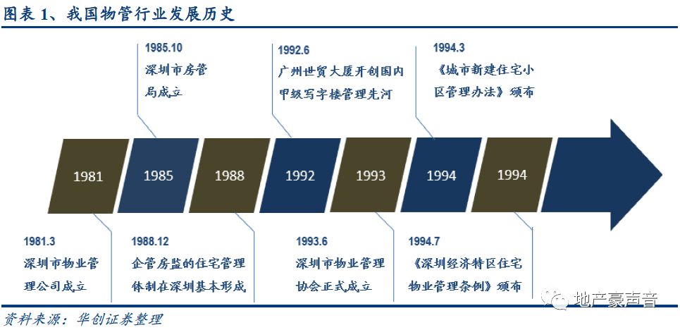 (一)历史概况:我国物业起步于80年代,94年开始迈向法制化轨道,03年开始监管趋于市场化