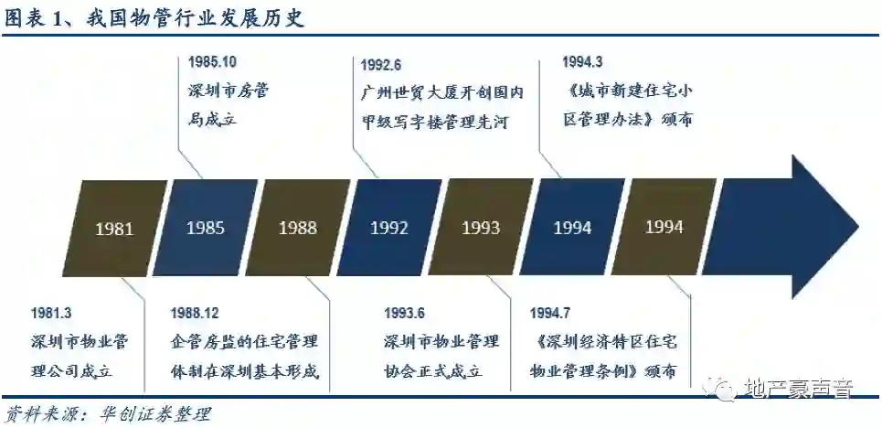 1、发展历史:我国物业诞生于80年代、起步于深圳,94年首次发布《管理办法》、迈向法制化轨道