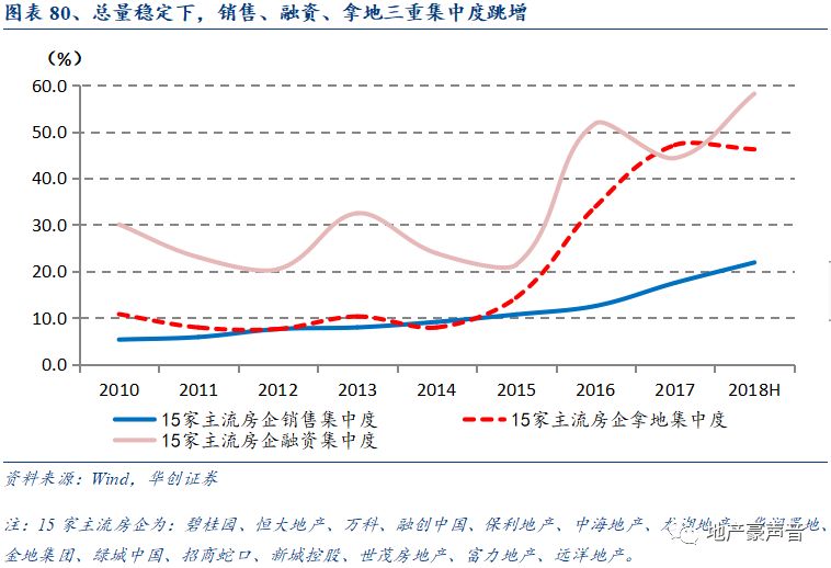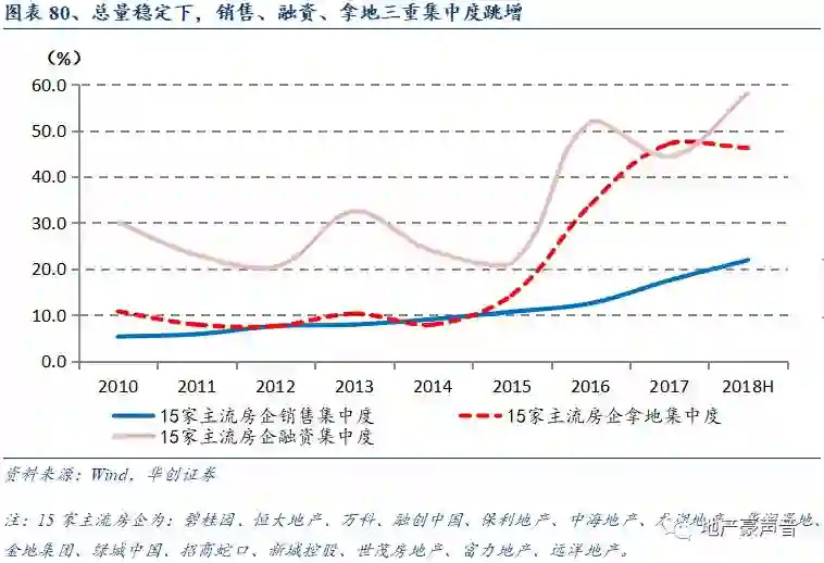 销售方面,随着融资集中度和拿地集中度的双重提升,推动房企销售在16-18年中也呈现出了较强的集中度的提升。在2011-2015年中,TOP10房企的销售集中度稳定提升,由2011年的6%逐步提升至2015年的17%,但在2016-2018年中出现销售集中度的快速跳增,由2016年的19%快速提升至2018H1的29%,源于近两年土地市场供给端政策调控导致土地资源快速向龙头房企集中,从而推动龙头房企的可售资源的迅速提升,带动销售集中度的快速跳增。