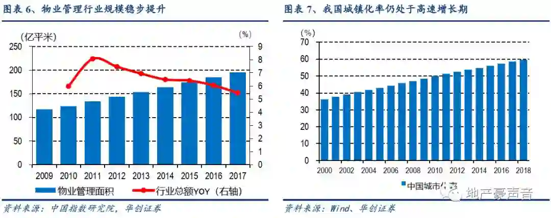 据中国指数研究院数据,截至2017年末,全国物业管理行业管理面积达195亿平米,同比增长5.5%,2009-2017年CAGR为6.6%,行业管理面积稳步提升,并仍处于规模成长期。截至2018年,我国城镇化率达59.6%,低于1990年日本的77%,并低于1970年美国的81%。而美国和日本分别在1940年和1955年达到了56.5%和56.1%,城镇化率50%-70%在国际上均为快速城市化阶段,城镇化率快速提升将推动行业管理面积稳步提升。