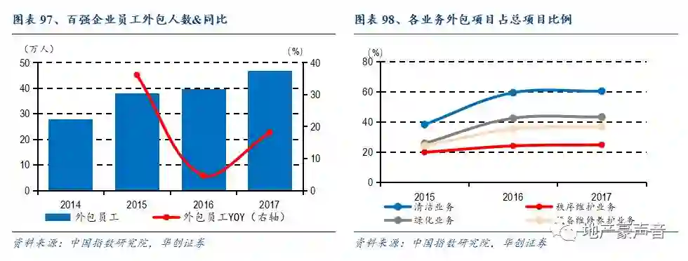 2017年,百强企业外包员工总数为46.9万人,同比增长18.1%,外包员工占一线员工的38.3%。其中,清洁业务、秩序维护业务、绿化业务和设备维修养护业务外包比例分为60.3%、24.7%、43.1%和36.8%。适度增加外包比例,一定程度上可降低刚性成本。