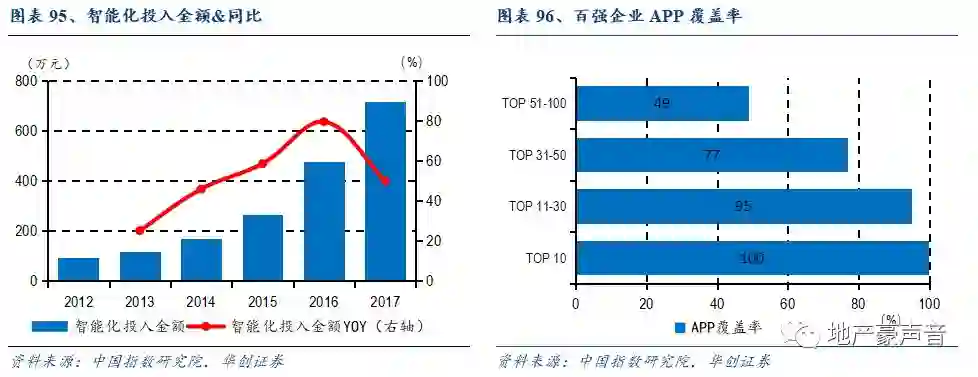 截至2017年,百强企业人均产值14万元,同比+15.5%;人均在管面积5,913万方,同比+12.5%,物管企业人均效能持续提升。2017年,百强企业平均智能化投入金额716.2万元,同比+49.8%;前10强企业的APP覆盖率达100%,物业管理公司对于科技方面的研发投入高增,随着技术变革、科技赋能,未来物业服务行业有望实现人均效能的进一步提升,压缩成本空间,从而带动利润空间提升。