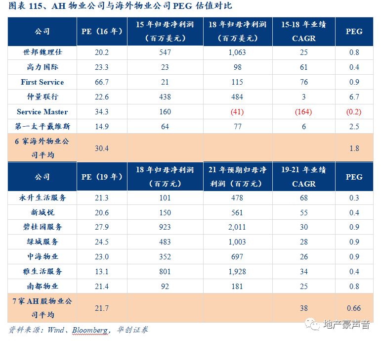 另外,我们按照未来三年业绩增速对应PEG来看,剔除仲量联行、Service Master、第一太平戴维斯三家公司(由于业绩增速较低致PEG过高),剩余3家主流物管公司16年平均PEG约0.69倍,而19Q1末AH股7家物业公司对应未来3年平均PEG为0.66倍,较海外平均水平相近,显示物管公司PEG合理估值约为0.68倍,并且鉴于上述AH股7家物管公司未来3年业绩GAGR高达38%(Wind一致预期),将推导出主流物管公司合理PE约为26倍、并且业绩增速越高应享受更高估值。
