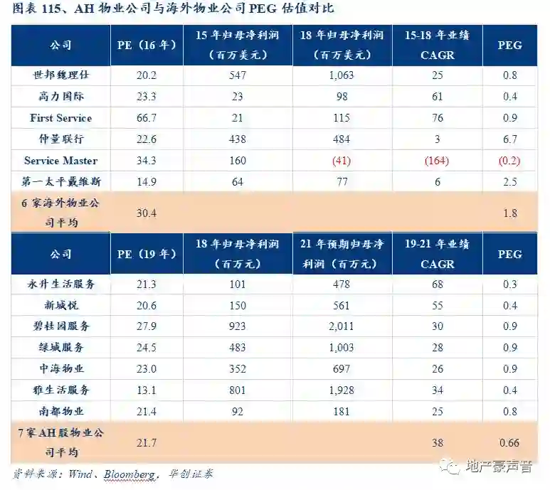 1)从PE来看,19Q1末,6家海外物管公司平均PE为23.9倍,高于7家AH股物管公司平均PE为21.7倍,物管公司合理PE区间或为20-30倍;2)从PEG来看,16年3家海外物管公司平均PEG约0.69倍,相近于19Q1末AH股7家物管公司平均PEG为0.66倍,物管公司合理PEG或为0.68倍,鉴于AH股7家物管公司未来3年业绩GAGR高达38%(Wind一致预期),将推导出主流物管公司合理PE约26倍、并且业绩增速越高应享受更高估值;3)从市值来看,19Q1末,CBRE、Service Master、JLL市值分别达164、73、63亿美元,显著高于我国物管龙头、并预示后者市值仍有大幅提升空间。