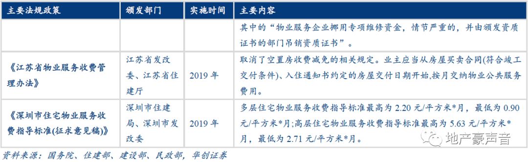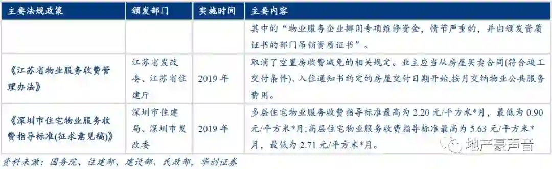 2019年1月,江苏省明确空置房物业服务费不再减免;深圳市住建局与市发改委发布《深圳市住宅物业服务收费指导标准(征求意见稿)》,多层住宅物业服务收费指导标准最高为2.20元/平方米*月,高层住宅物业服务收费指导标准最高为5.63元/平方米*月,比目前施行的住宅物业服务收费指导标准均有提高;目前来看,物业管理行业政策总体偏友善。