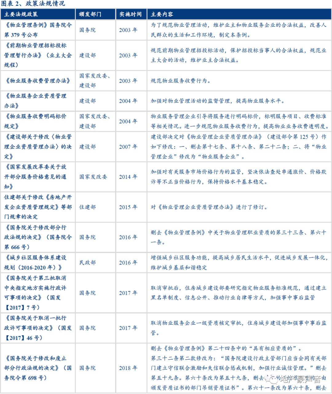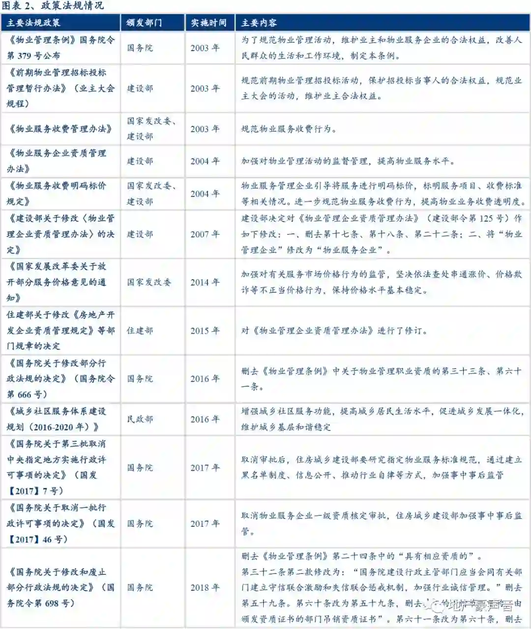 2、政策演变:03年颁布《物业管理条例》,监管趋于市场化,目前行业政策总体偏友善
