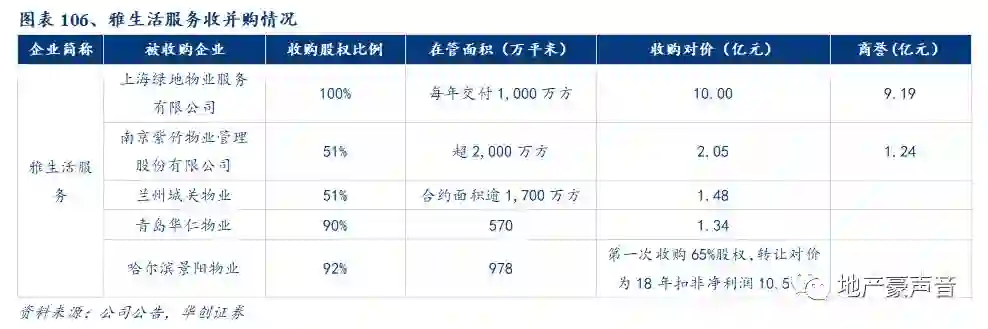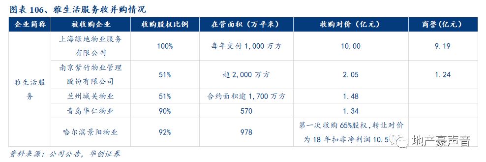 以雅生活服务为例,2017年6月30日,绿地控股公告称,以10亿元价格出售全资子公司上海绿地物业服务有限公司100%股权给雅居乐集团,并与雅居乐物业达成战略合作,绿地未来5年每年将向雅居乐提供不高于1,000万方物业管理面积,而雅居乐收购绿地物业产生的商誉达9.19亿元。