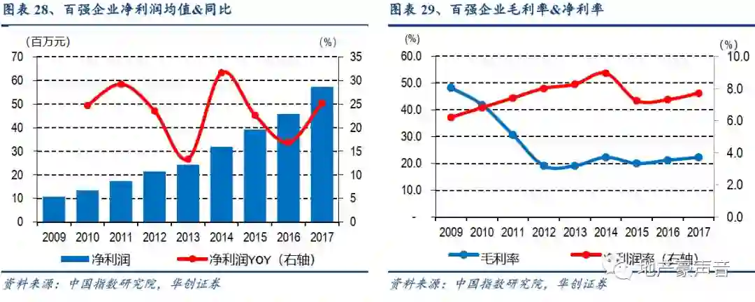 2、17年百强企业毛利率22.3%、净利率7.7%,分别+1.2pct、+0.4pct,盈利能力持续提升