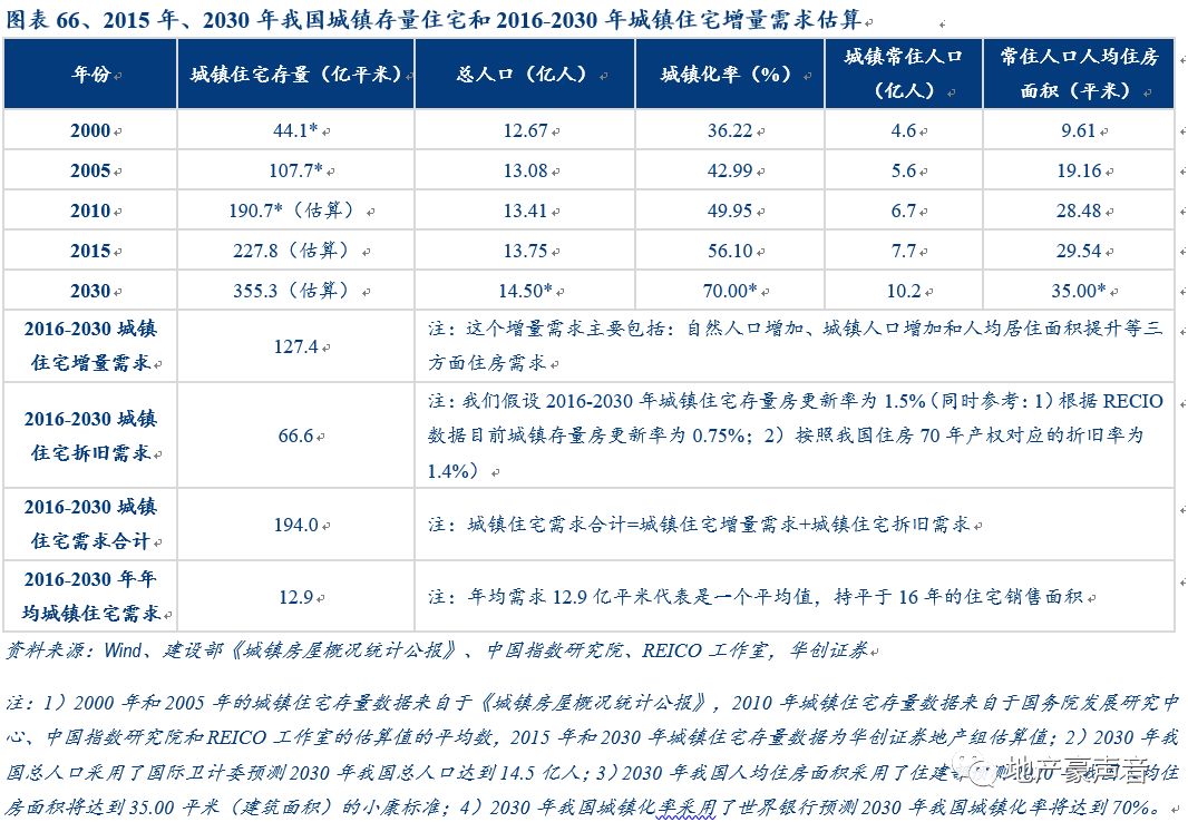 (注:上文中的三个2030年的基本假设:城镇化70%、人均住房面积35平米以及城镇存量住房更新率1.5%,基本面上都还是保守的假设,这三个指标分别有可能达到更高的水平,因而至2030年住房需求可能比预测要更高。)