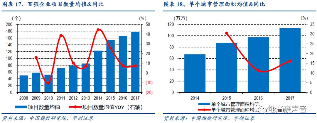 据中国指数研究院数据,截至2017年末,全国物业管理百强企业管理面积均值达3,163.8万平米,同比增长16.1%,2008-2017年CAGR为19.9%,高于行业2009-2017年的CAGR为6.6%,表明集中度逐步提升。截至2017年末,全国物业管理百强企业储备面积均值达420.0万平米,同比增长84.6%;百强企业项目数量均值178个,同比增长7.2%;单个城市管理面积均值达113.0万平米,同比增长16.1%,规模扩张的同时伴随着城市深耕。