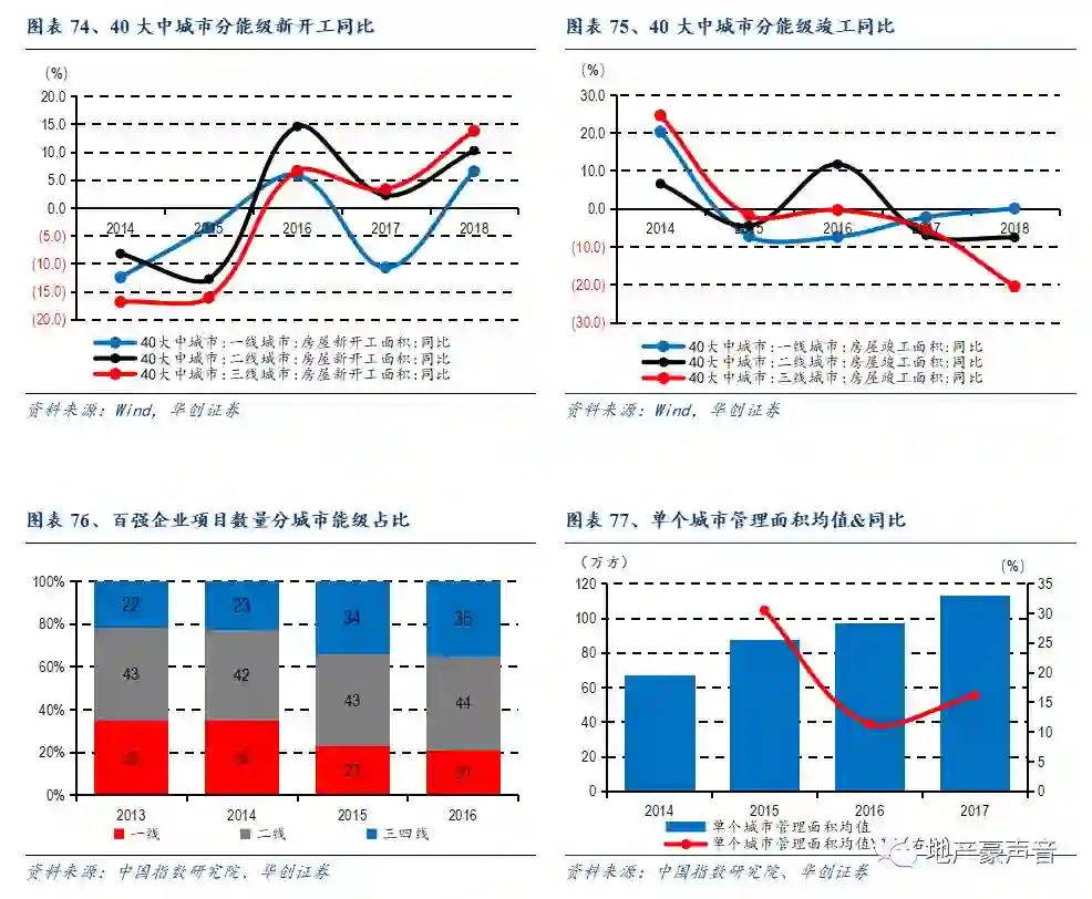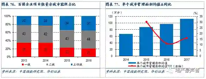 2016年,百强企业在一线城市、二线城市、三四线城市的项目数量分别占比21%、44%、35%,较15年分别-2pct、+1pct、+1pct,印证了物业管理的城市能级分布正逐步由一二线向三四线下沉。