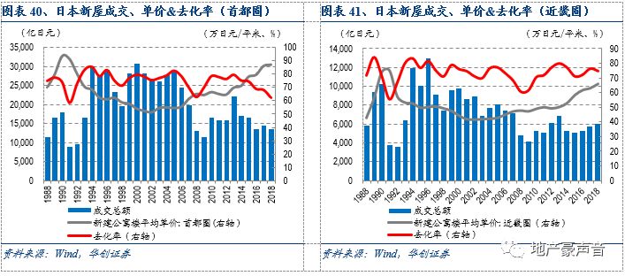 由于所处城镇化率阶段、人口总量上的不同,中国和美国以及日本每年的新房成交量存在量级上的差异。2018年,中国商品房销量17.2亿平米,粗略按照套均100平米估算,2018年中国新房成交约1,720万套,而美国2018年新屋成交仅61.7万套,仅相当于同年中国商品房销售套数的3.6%。2018年,美国新屋销售额2,014亿美元,日本首都圈与近畿圈合计新屋成交额19,553亿日元,分别对应13,813亿元、1,222亿元人名币,分别为同年中国商品房销售额13.37万亿的10.3%、0.9%。