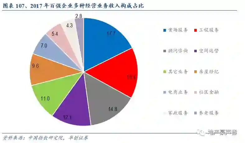 2017年,百强企业多种经营收入均值达1.35亿元,同比增长24.5%;百强企业增值服务收入占比18.2%,较2016年+0.9pct,增值服务净利润占比达41.7%,同比+2.4pct,隐含增值服务的利润率远高于基础服务,增值服务将是未来企业关键盈利点。结构上来看,增值服务收入中,案场服务、工程服务、空间运营、顾问咨询占比较高,分别占比17.7%、15.4%、14.8%、12.1%。可以发现,增值服务涵盖领域多种多样,包括房屋经纪、社区金融、电商业务、家政服务,甚至包含养老、早教等具备一定专业壁垒的方向,增值服务之间可能有一定协同性,但仍具有相当的独特性,我们认为物业公司很难实现对各个领域的全面覆盖,更可能发展为各自聚焦某一专业领域的格局,因而行业竞争格局较难加剧。