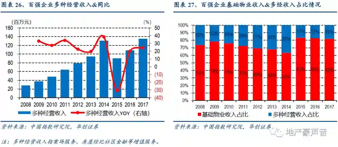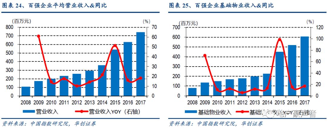 1、17年百强企业平均营业收入7.4亿元,同比+18.2%、基础物业和多种经营分别占比82%、18%
