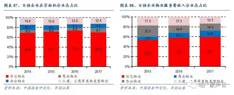 分业态来看,2017年,百强企业在管面积中,住宅物业占比69.9%,较2016年下降3.3pct,商业物业、办公物业、工建、工商等其它类型物业分别占比8.7%、9.1%、12.4%,较2016年分别+2.5pct、+2.0pct、-1.1pct。在住宅物业总量快速提升阶段,商办和工建物业仍保持占比稳定甚至提升,多种业态全面发展。