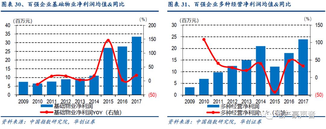 截至2017年末,百强企业净利润均值达5,730万元,同比+25.2%;2017年,百强企业毛利率和净利率分别为22.3%、7.7%,分别较2016年+1.2pct、+0.4pct,盈利能力持续提升。其中,基础物业净利润3,340万元,同比增长20.2%,多种经营收入2,390万元,同比增长33.0%。