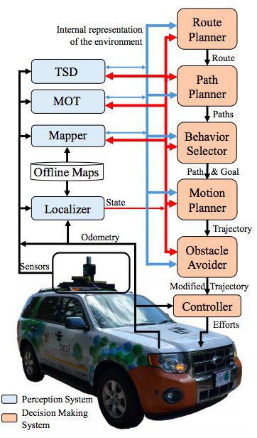 自动驾驶汽车的自主系统的架构通常可分成两大类:感知系统和决策系统 [PAD16]。感知系统通常分为负责自动驾驶汽车定位、静态障碍物地图测绘、移动障碍物检测与跟踪、道路地图测绘、交通信号检测与识别等多种任务的许多子系统。决策系统通常也分为许多子系统,分别负责路线(route)规划、路径(path)规划、行为选择、运动规划、控制等。但是这样的划分方式有些模糊,文献中也还存在一些不同的划分方式 [PAD16]。