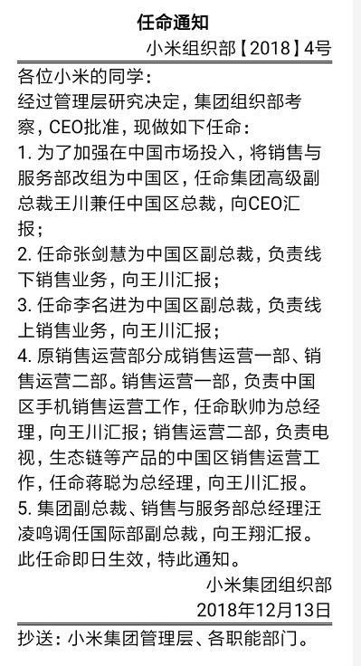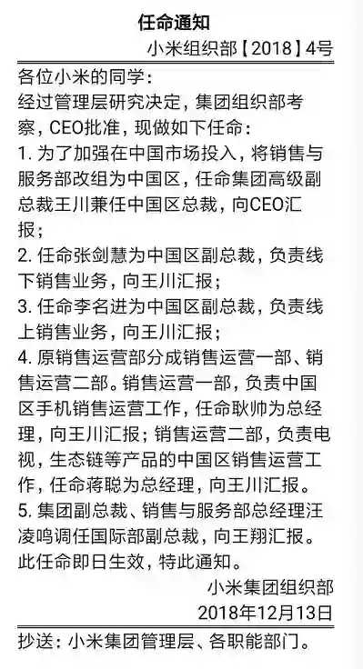 随着这封邮件的发出,看得出来小米组织部已经在内部发挥作用,履行中高层干部的聘用、升迁等职能。