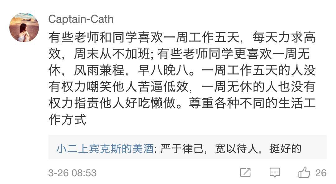 有人当然会说学生没按导师规定做研究也不对?首先,一周工作 7 天是否合理先不讨论,更重要的是它不应该存有强迫性质,更何况科研水平也不只是靠时间堆积而成的。其次,既然导师和学生再相处过程中互有不满,那是不是在双向选择上另有调整空间?当然这就涉及到高校对导师与学生培养的管理水平了。