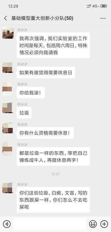 根据爆料截图来看,应该是其学生要求休息,这导致导师倪某大为光火,连发数条情绪激动的侮辱性言论。另有疑似该校学生指出,该博导要求学生的工作时间是“917”,也就是每天早 9 点上班,凌晨 1 点休息,并且每周工作 7 天无休。